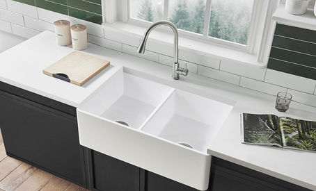Farm sink, Farmshouse Sink ou Cuba Estilo Fazenda são modelos versáteis que apesar de chamativos combinam com diversos estilos.